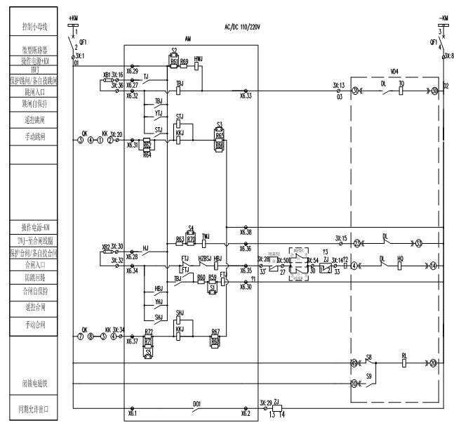 此外,此次二次系统改造在设计上还考虑了闭锁,051合闸回路中串入来自061进线柜和母联柜060断路器接点,同理其它进线断路器亦均接入了闭锁条件。对于V段备用进线柜052,还在其合闸回路中串入采自0477地刀的闭锁信号,VI段进线柜061的合闸回路中同样串入了0137接地刀闸的信号,作为闭锁条件,即接地开关在合闸位的情况下,断路器是合不上的,这样就可以避免带地刀合闸的情况的出现。具体的控制回路二次原理图如图2所示。