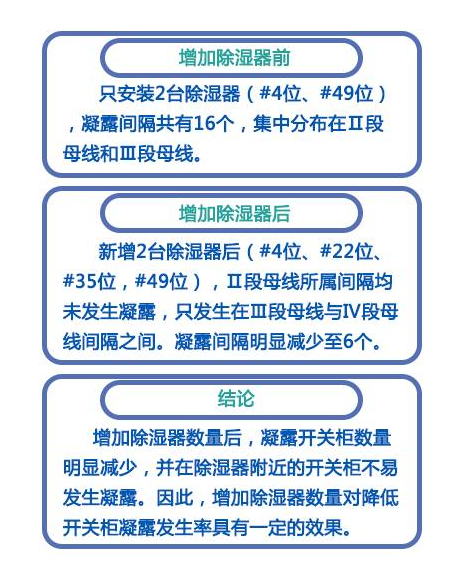 现场检查发现,增加两台除湿器后,共有6只间隔开关柜的前柜门观察窗有凝露现象,打开前柜门无水珠,后柜门均良好。