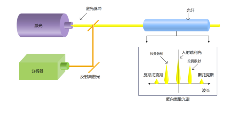 其测温系统中激光器发出的脉冲光注入光纤中时,由于介质的非均匀性,入射光一方面沿入射方向定向传播,另一方面则会发出向其它方向的散射光,其中散射方向与入射方向相反的光即为后向散射光。根据散射光波长与入射光波长的关系,散射光可分为瑞利散射光、布里渊散射光和拉曼散射光三种,其中拉曼散射只对温度敏感,分成斯托克斯和反斯托克斯散射光,后者对温度更为敏感;两种散射光的光强均与温度变化成比例,测量及计算分析两种散射光的光强之比即可得到光纤的温度。